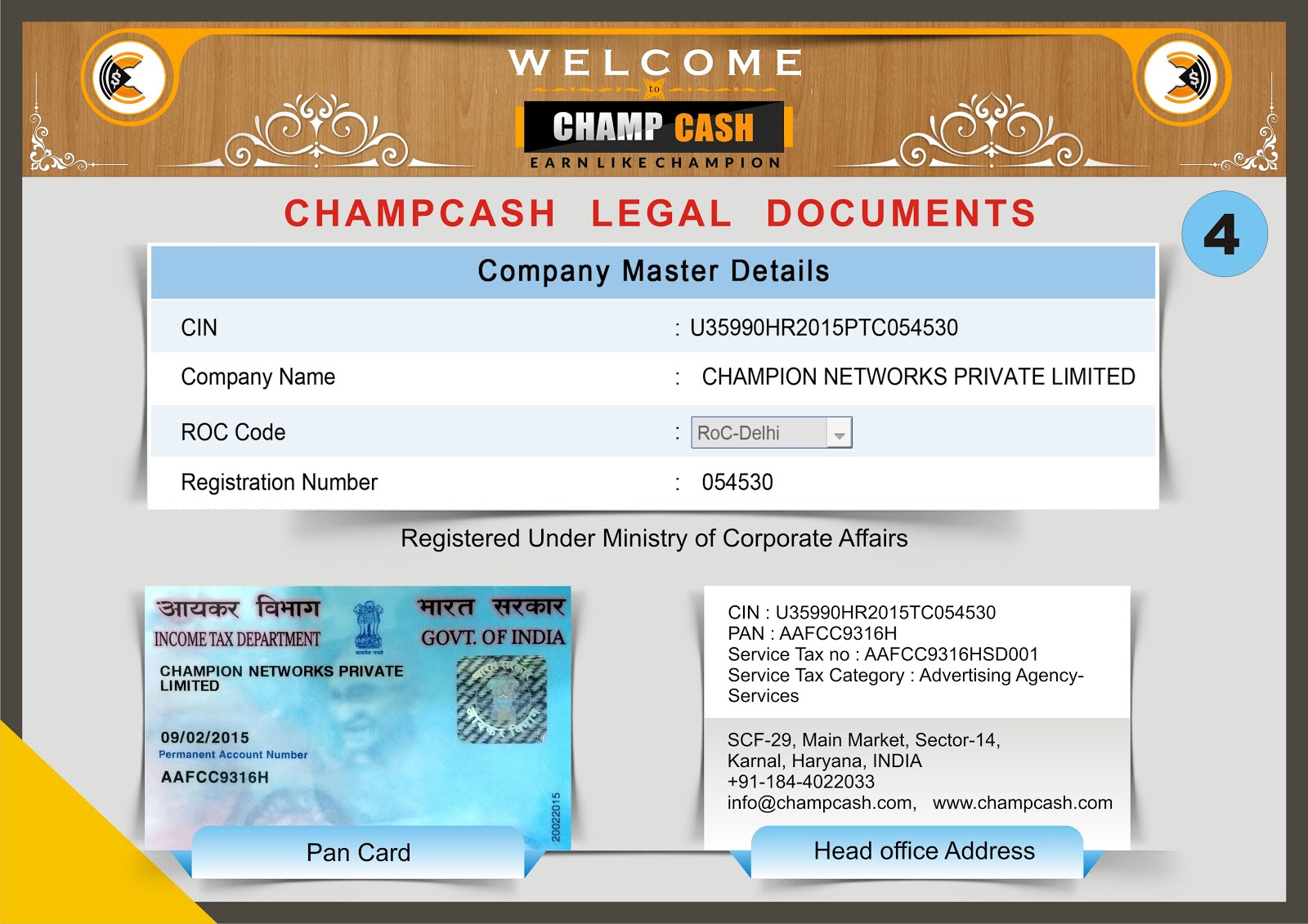 कम्पनी(Champion network pvt ltd.) का हेड आँफिस करनाल, हरियाणा में है। कम्पनी का Founder & Director Engineer Mahesh Verma ji हैं। कम्पनी Ministry of Corporate Affairs, Govt of India में registered हैं।